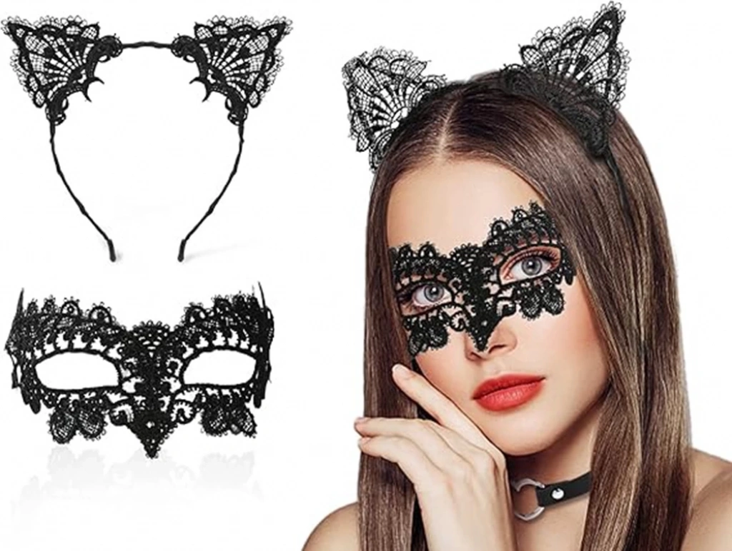 Siyah Renk Dantel Maske Ve Dantel Kulak Taç Seti Yetişkin No 10